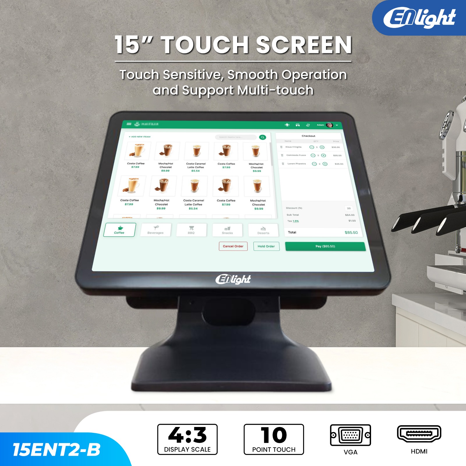 Enhance interaction with both customers and staff using a double-sided 15-inch touch screen — perfect for retail, cafés, and point-of-sale environments.